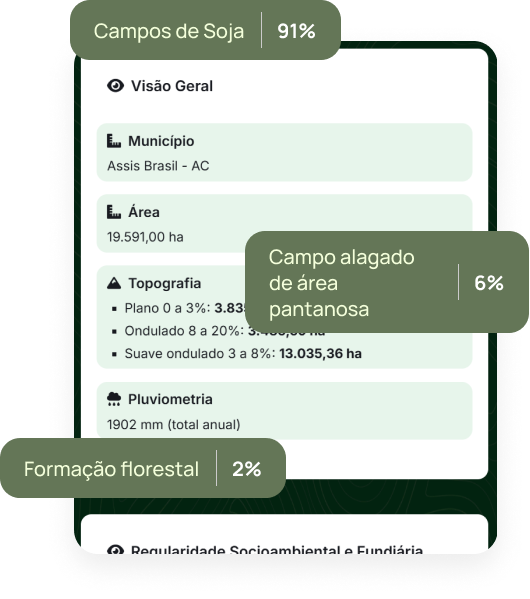 Todos os relatórios incluem os blocos de informação abaixo, combinando bases oficiais como CAR, SIGEF, SNCI e dados socioambientais para apoiar decisões de crédito e de gestão territorial.